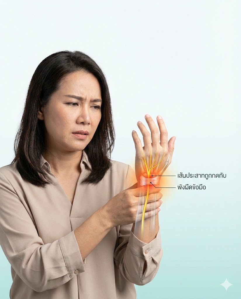 - พังผืดทับเส้นประสาทที่ข้อมือ (Carpal Tunnel Syndrome): อันดับ 1 ของคนทำงานออฟฟิศและแม่บ้าน! จะมีอาการชาที่ นิ้วโป้ง นิ้วชี้ และนิ้วกลาง มักปวดชามากตอนกลางคืน หรือตอนตื่นนอน